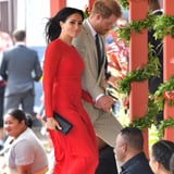 We've long awaited Meghan Markle and Prince Harry's 16-day tour to Australia, Fiji, the Kingdom of Tonga, and New Zealand, and the royal couple kicked things off with a special announcement: they're expecting their first child! That means Meghan's going to be debuting a list of designers she trusts to create custom outfits for her maternity wardrobe.